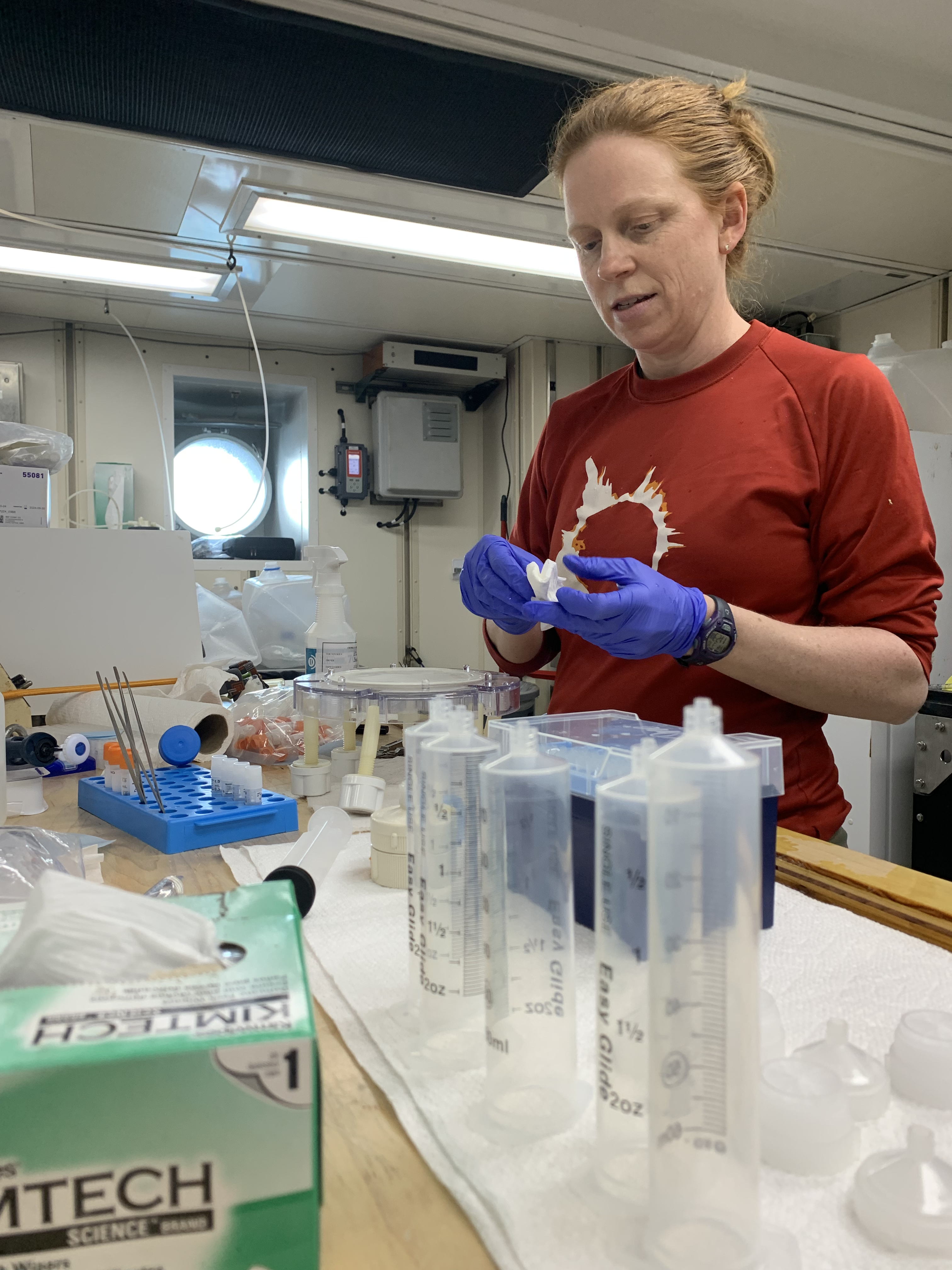 After learning the ropes in the ETSP, Montana State Graduate student Annabelle Adams-Beyea is at sea in the the Bay of Bengal on the R/V Thompson collecting the third set of viral samples under the guidance of collaborator and Chief Scientist Maria Pachiadaki.